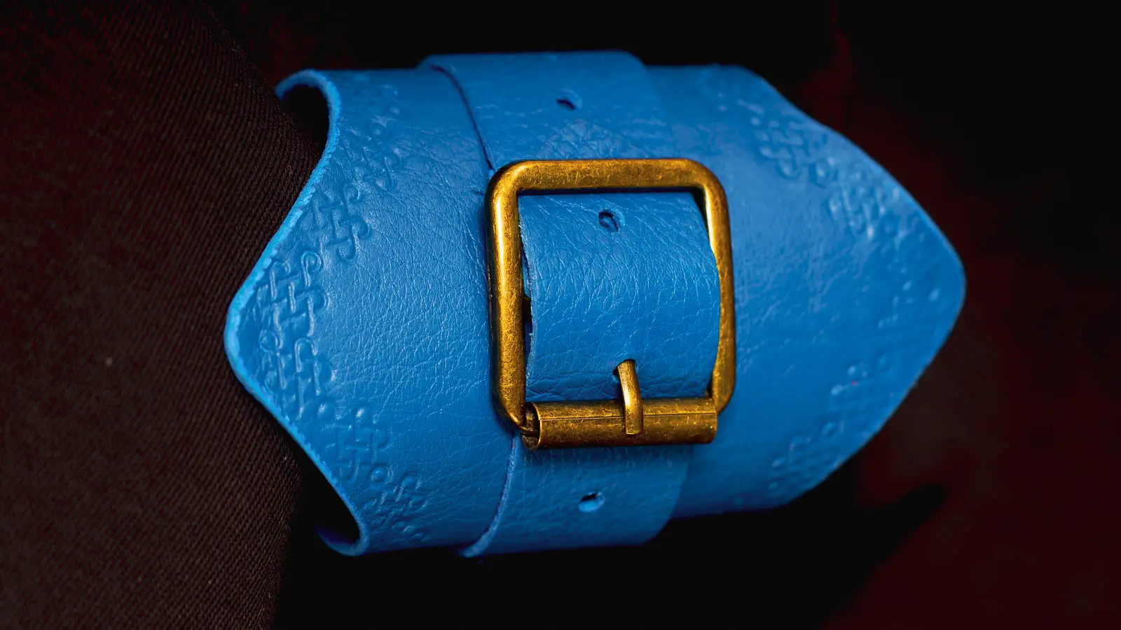 Orné de motifs d’inspiration celtique, il se distingue par une fermeture frontale composée d’une large boucle en métal aux finitions cuivrées.