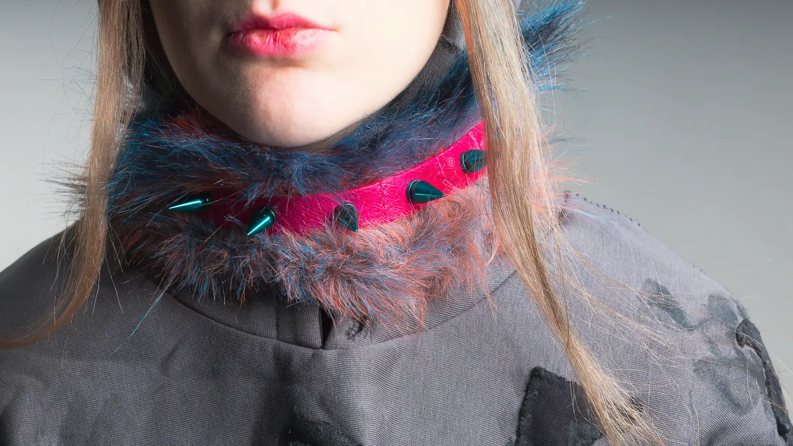 Les piques turquoise ajoutent une touche futuriste à ce col montant, transformant cet accessoire en une déclaration de mode audacieuse.