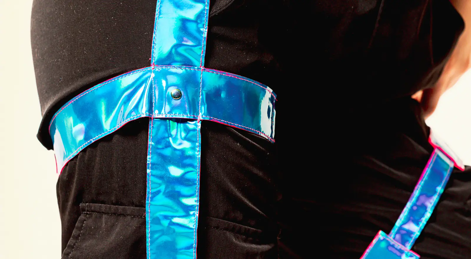 Ses reflets bleus et ses finitions roses évoquent une esthétique Cyberpunk, conférant à ce harnais aux lignes épurées une identité futuriste audacieuse.